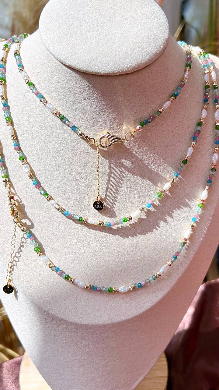 The seed of inspiration was planted in December 2023, taking the vague outline of a thought: “layered necklaces”. But it was only over Chinese New Year 2024, when our founder caught herself yearning for beaded necklaces suitable for any occasion, big or small, that she was galvanised into creating the CRZtrésor line. A brief was sent to our production house. Their task? To dig through our current buckets of crystals, sort out suitable materials and begin the procurement process for the sparkliest natural crystals of the highest quality.