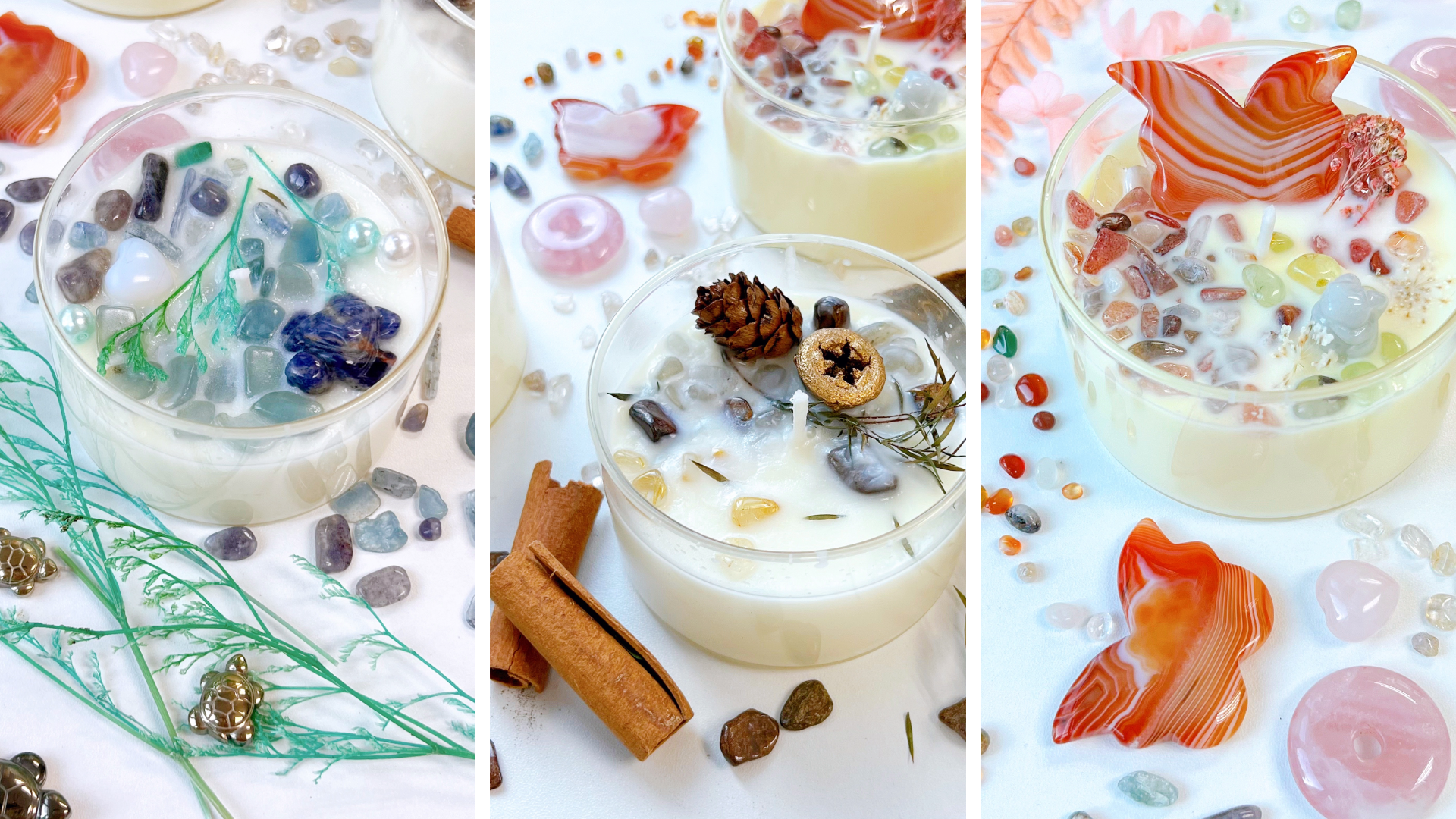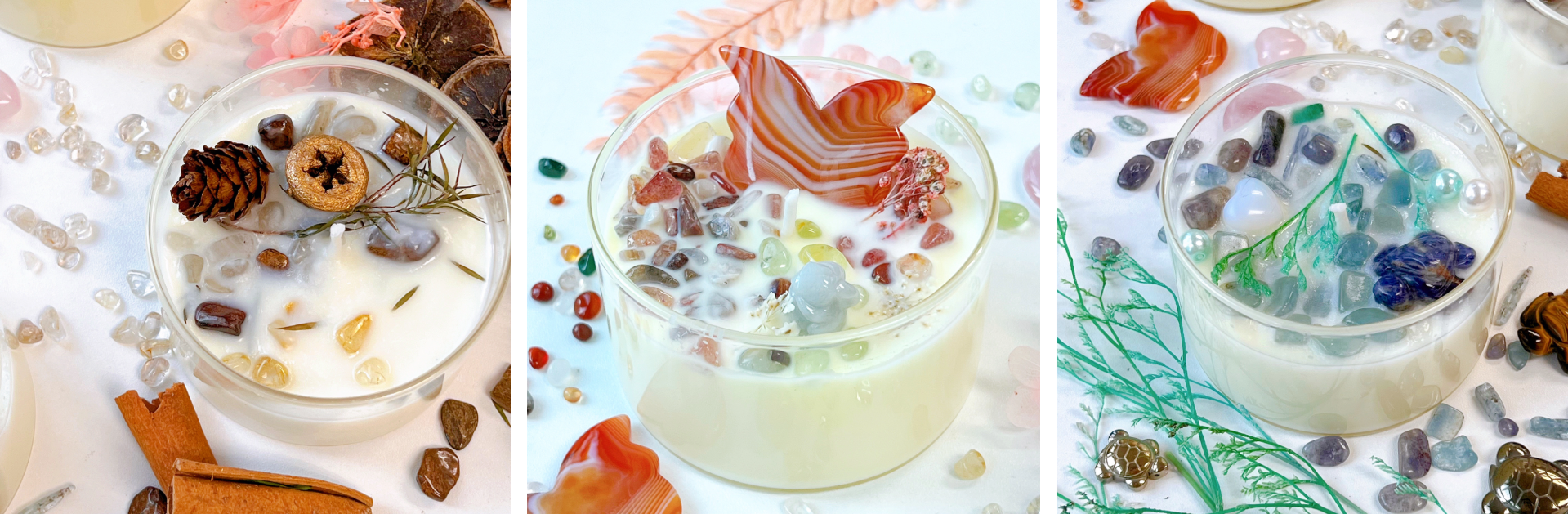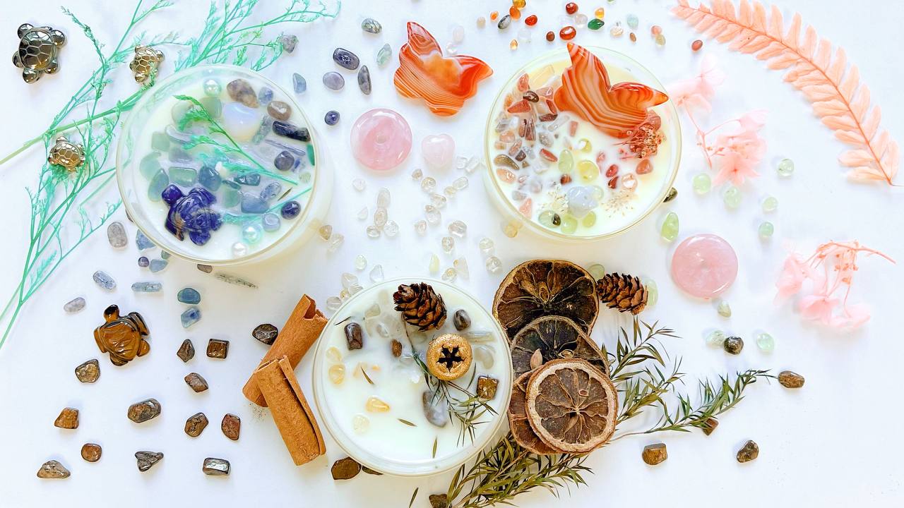 Crystal Selection: Delve into the magical world of crystals as you handpick natural crystals to adorn your candles. Discover the unique properties and energies of each crystal, allowing you to tailor your candles to your intentions and desires. These crystals not only add visual appeal but also imbue your candles with positive vibrations that uplift your spirit and create a sense of well-being.