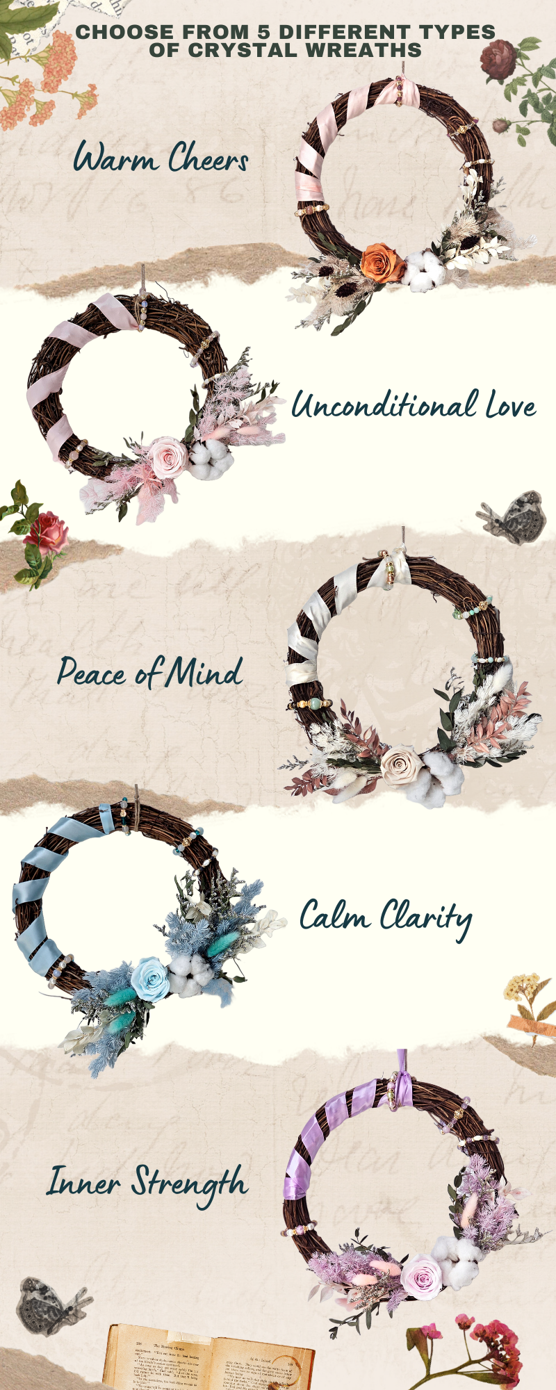 - Each participant will receive a wreath base, everlasting flowers and an assortment of natural healing crystals beads based on selected type of Crystal Wreath, wire, and all other necessary tools.