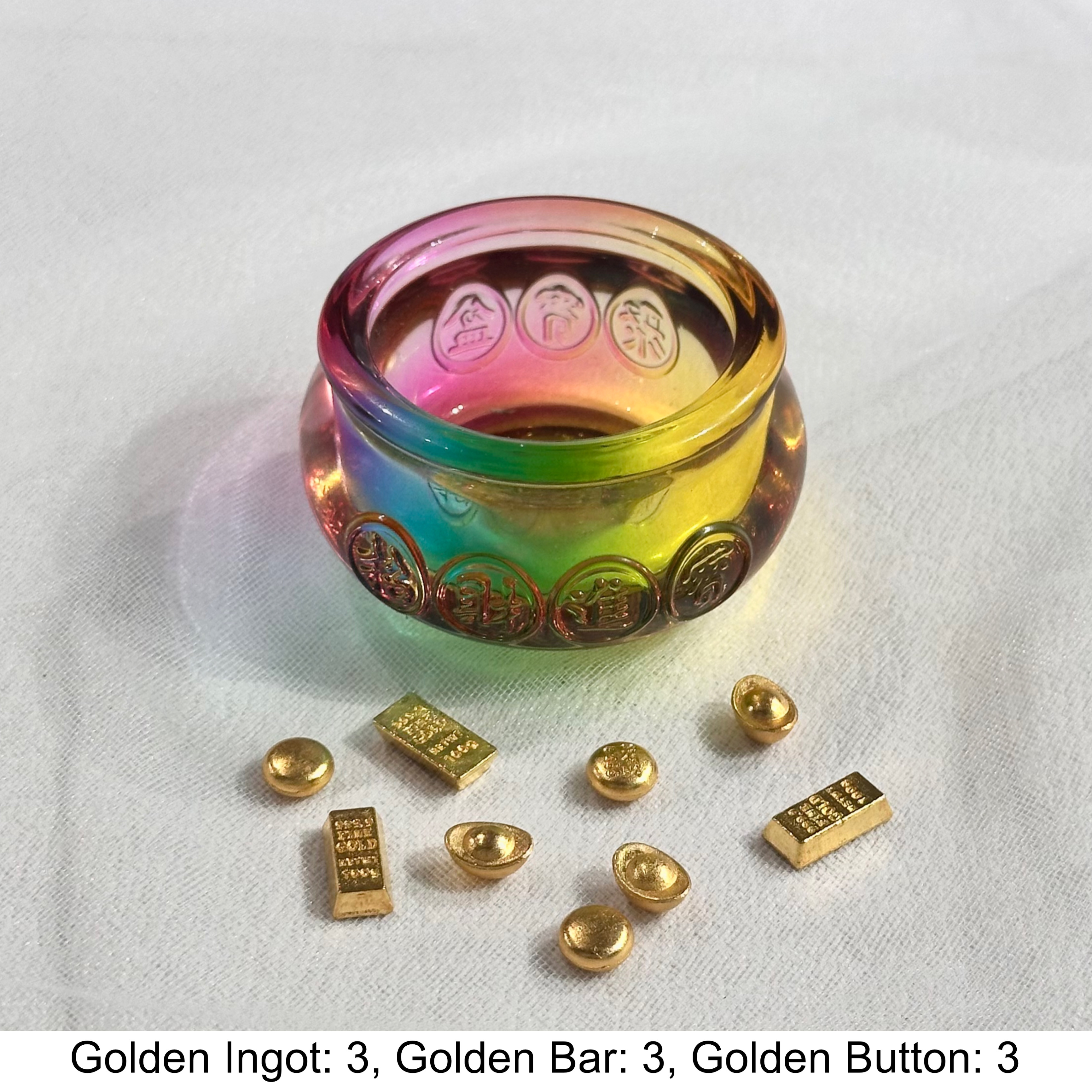 Every Ju Bao Pen includes: Gold Ingots, Gold Bars, and Gold Buttons (Refer to image for quantity per size).